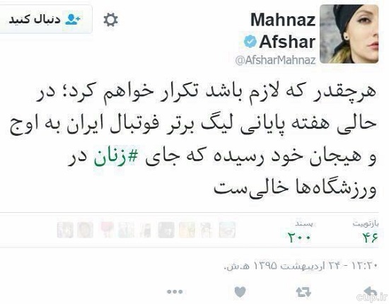 روزنو :بازیگر مشهور سینما جای زنان را در هفته پایانی لیگ برتر خالی دانست.مهناز افشار، بازیگر مشهور سینما در فاصله چند ساعت مانده تا شروع بازیهای پایانی لیگ برتر در توئیتی نوشت: «هر چقدر که لازم باشد تکرار خواهم کرد؛ در حالی که هفته پایانی لیگ برتر فوتبال ایران به اوج و هیجان خود رسیده که جالی زنان در ورزشگاهها خالی است.»