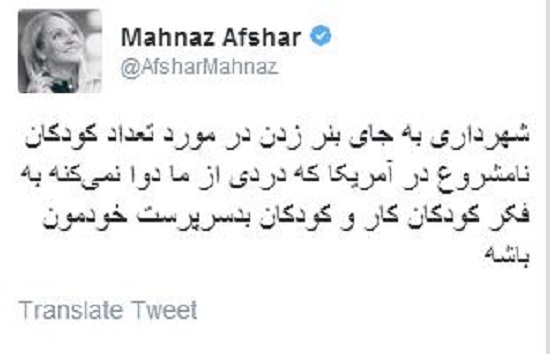 روزنو :مهناز افشار (بازیگر سینما) در صفحه توییت خود از اقدامات شهردار تهران در نصب برخی بیلیوردها در سطح شهر انتقاد کرد.مهناز افشار از وضعیت کودکان کار و بد سرپرست در کشور را مورد تاکید قرار داد. او در توییت خود نوشت: