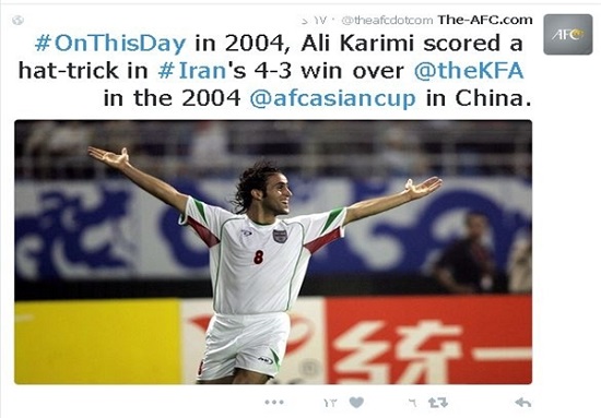 AFC در توئیتر خود با انتشار عکس کریمی این طور نوشت: در سال 2004 در چنین روزی علی کریمی در بازی ایران برابر کره جنوبی در جام ملت‌های آسیا 2004 هت‌تریک کرد.