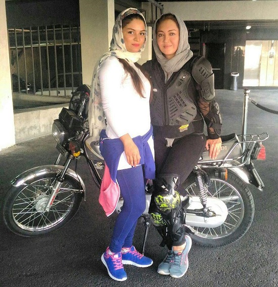 بهناز شفیعی موتور سوار زن ایرانی یکی از چهره های شناخته شده در ایران و جهان است که عناوین قهرمانی متعددی دارد. در این عکس وی به همراه نیکی کریمی بازیگر سرشناس سینمای کشورمان در حال آماده شدن برای موتور سواری دیده می شوند.