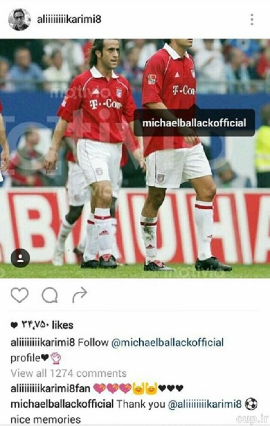همین مساله باعث شد تا میشائیل بالاک کاپیتان سابق تیم ملی آلمان و بازیکن بزرگ تیمهای لورکوزن، بایرن مونیخ و چلسی به این پست جادوگر ایرانی واکنش دهد و کامنتی با مضمون "ممنونم علی کریمی، خاطرات زیبایی بود" بگذارد و از علی کریمی تشکر کند.