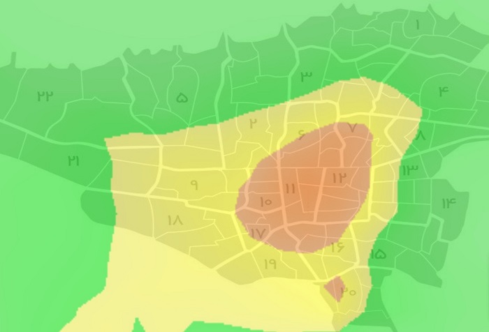 در نقشه زیر مناطق آلوده تهران در ظهر امروز را میبینید؛ نارنجی مناطقی است که هوا برای گروههای حساس ناسالم است و ظهر هوای سالم را نشان میدهد. سبز هم هوای پاک را.