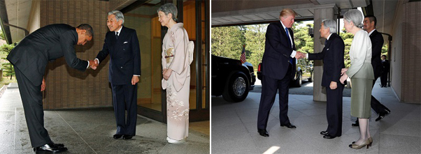 برخلاف باراک اوباما ، دونالد ترامپ هنگام ملاقات با امپراتور ژاپن به او تعظیم نکرد. تعظیم کردن اوباما به امپراتور ژاپن با انتقاداتی در آن زمان در داخل آمریکا رو به رو شد.