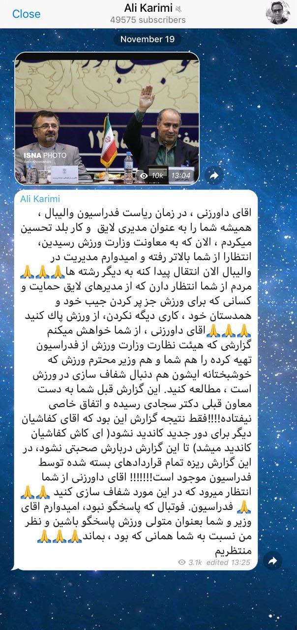 در ادامه کشمکشهای زیاد بین فدراسیون فوتبال و علی کریمی، جادوگر بار دیگر اقدام به نوشتن یک مطلب در کانال تلگرامی خود کرد و این بار از محمدرضا داورزنی و وزارت ورزش درخواست پیگیری دارد.