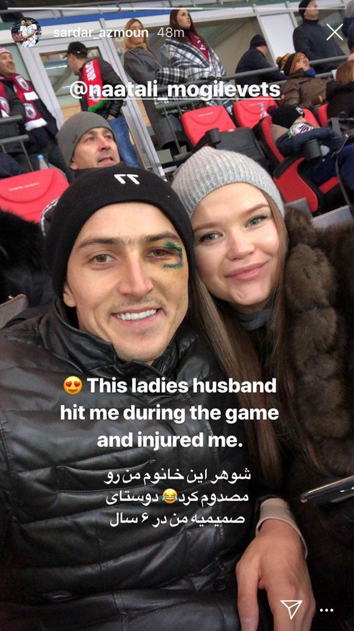 اما همسرپاول میگیلوتس، که شوهرش عضو تیم روبین کازان و همبازی سرداراست و بازیکن ایرانی بخاطر برخورد غیرعمدی با این بازیکن مصدوم شده به دیدن سردار آزمون رفته و بخاطراین اتفاق از او دلجویی کرده است. ازمون هم تصویر این ملاقات را در شبکه اجتماعی خود قرار داده و نوشته:«شوهراین خانم من را مصدوم کرد. دوستای صمیمیه من در6 سال.»
