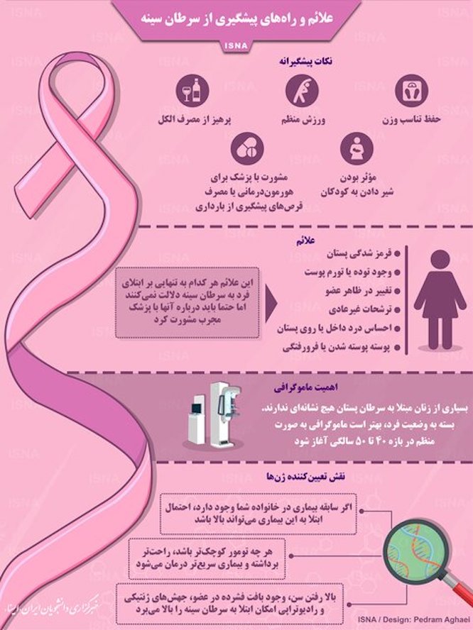 روزنو :اکتبر، ماه کارزار بین‌المللی برای افزایش آگاهی‌ها پیرامون سرطان پستان در سراسر جهان است. این نوع سرطان از گسترده‌ترین انواع سرطان‌ها در میان زنان است؛ با این حال، ابتلا به آن به معنای در انتظار مرگ نشستن نیست، بلکه تشخیص به موقع بیماری، شاه‌کلید نجات جان بیمار است. در این اینفوگرافی با علائم و راه‌های پیشگیری و درمان این نوع سرطان آشنا می‌شوید.