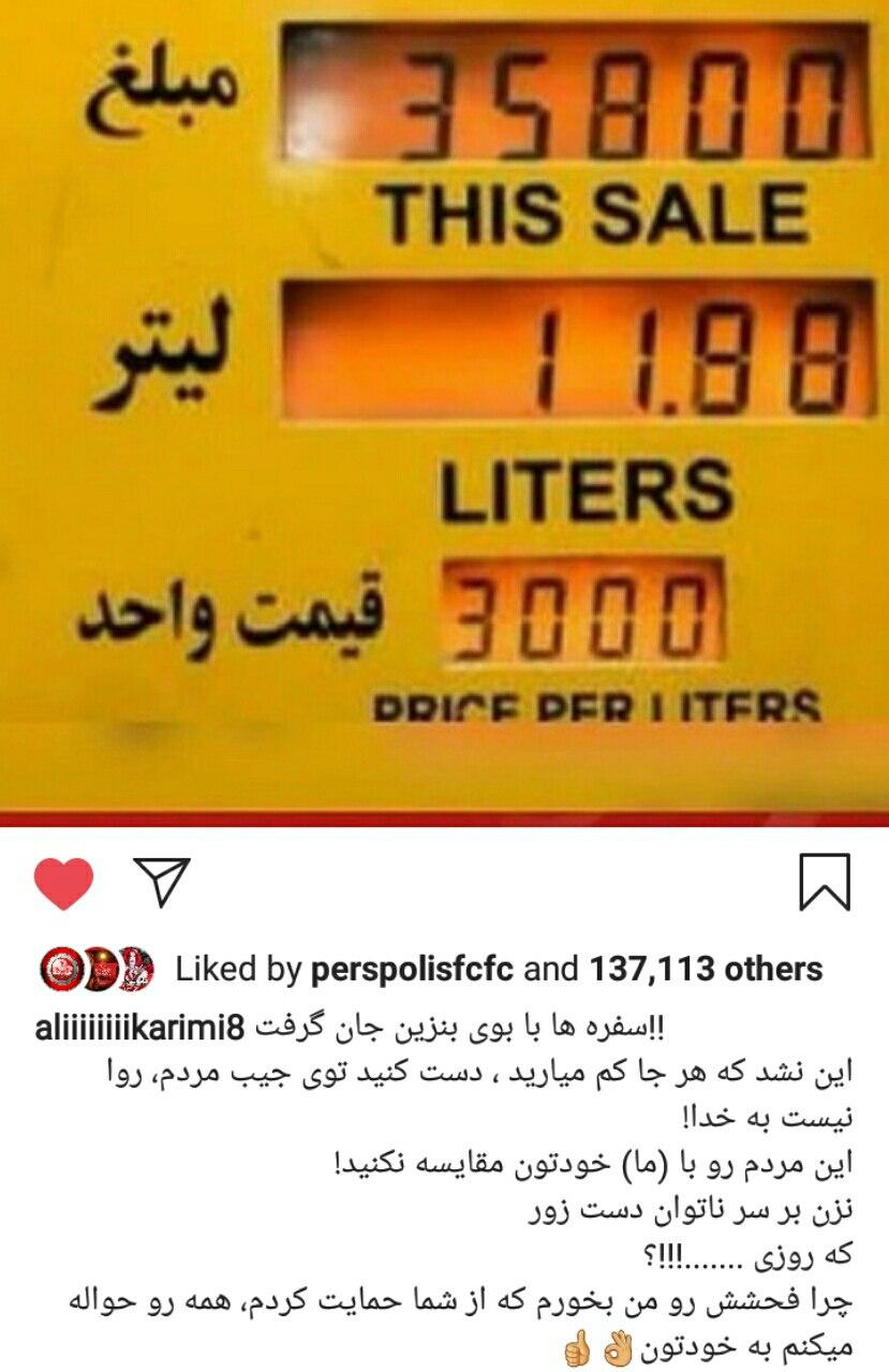 علی کریمی اسطوره محبوب فوتبال ایران و باشگاه پرسپولیس نیز که اغلب از مردم حمایت کرده است در این خصوص نیز با انتقاد از تصمیم دولت در یک پست فضای مجازی، تاکید کرد دولت هر جایی که کم می آورد دستش را در جیب مردم می کند.
