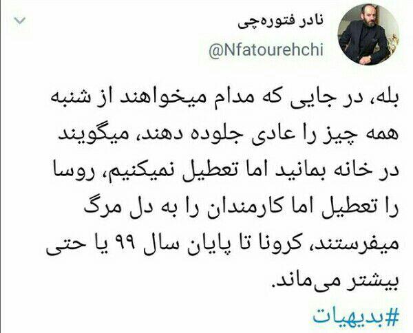 به گزارش روز نو، نادر فتورهچی در توییتر خود نوشته : درجایی که مدام میخواهند از شنبه همهچیز را عادی جلوه دهند، میگویند در خانه بمانید اما تعطیل نمیکنیم، روسا را تعطیل اما کارمندان را به دل مرگ میفرستند، کرونا تا پایان سال ۹۹ یا حتی بیشتر میماند.