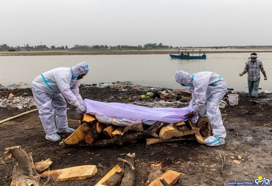 بستگان یک درگذشته به علت کرونا در ایالت شمالی اوتار پرادش هند آماده سوزاندن جنازه او در کنار رود گنگ میشوند