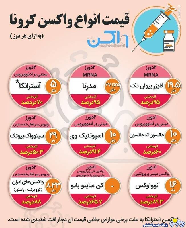 روزنو :قیمت انواع واکسن کرونا و قیمت واکسن ایرانی معلوم شد.
