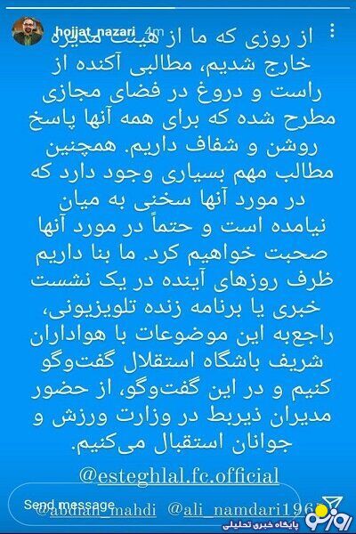 به گزارش روزنو، آن‌ها در این پیام نوشته‌اند: «از روزی که ما از هیئت مدیره خارج شدیم، مطالبی آکنده از راست و دروغ در فضای مجازی مطرح شد که برای همه آن‌ها پاسخ روشن و شفاف داریم. همچنین مطالب مهم بسیاری وجود دارد که در مورد آن‌ها سخنی به میان نیامده است و حتماً در مورد آن‌ها صحبت خواهیم کرد. ما بنا داریم ظرف روز‌های آینده در یک نشست خبری یا یک برنامه زنده تلویزیونی، راجع به این موضوعات با هواداران شریف باشگاه استقلال گفتگو کنیم و در این گفتگو، از حضور مدیران ذیربط در وزارت ورزش و جوانان استقبال می‌کنیم.»