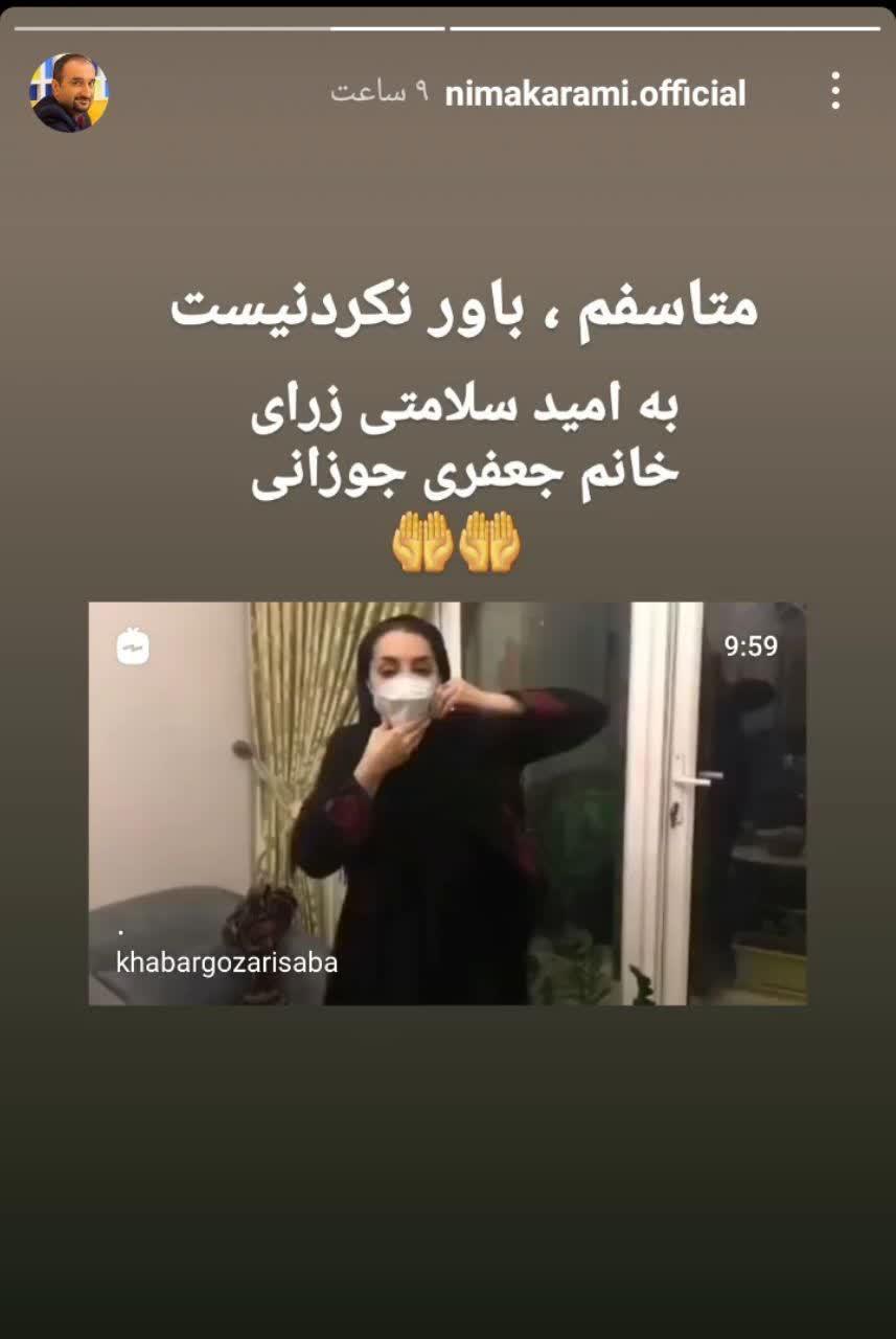 روزنو :نیما کرمی ، مجری تلویزیون در واکنش به فلج شدن فک سحر جعفری جوزانی براثر خطای پزشکی، استوری زیر را منتشر کرد.