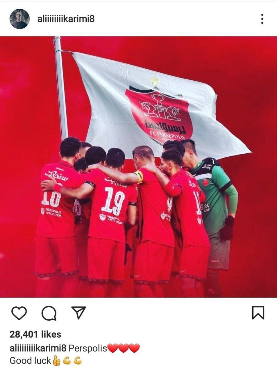 موضع حمایتی علی کریمی از پرسپولیس در مقاطع حساس همچنان ادامه دارد. کریمی این بار در آستانه دربی تهران و بازی فوق العاده حساس این تیم مقابل استقلال، با انتشار یک پست اینستاگرامی از پرسپولیسی حمایت کرد.
