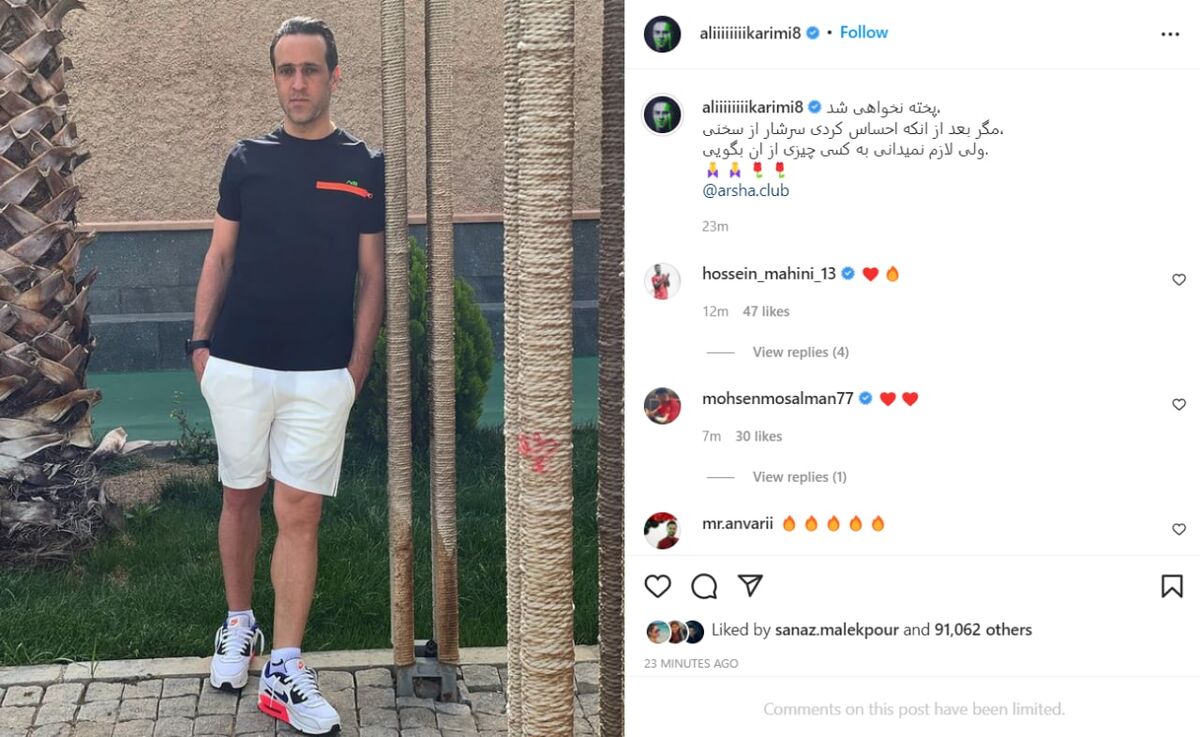 حالا در همین بحبوحه علی کریمی در اینستاگرامش عکسی از خودش منتشر کرد و چنین متنی زیر آن نوشت: «پخته نخواهی شد، مگر بعد از انکه احساس کردی سرشار از سخنی، ولی لازم نمی‌دانی به کسی چیزی از ان بگویی.»
