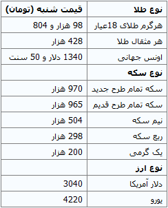 امروز شنبه در بازار غیر رسمی قیمت هر سکه تمام بهار آزادی در حدود 970 هزار تومان، هر گرم طلای عیار 98 هزار و 804 تومان و قیمت دلار 3040 و یورو 4220 تومان است.