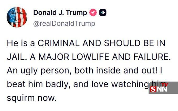 ترامپ در ادامه این مطلب کوتاه نوشت: «او (بایدن) یک آدم پست و شکستخورده بزرگ است؛ یک آدم زشت، چه از درون و چه از بیرون!»