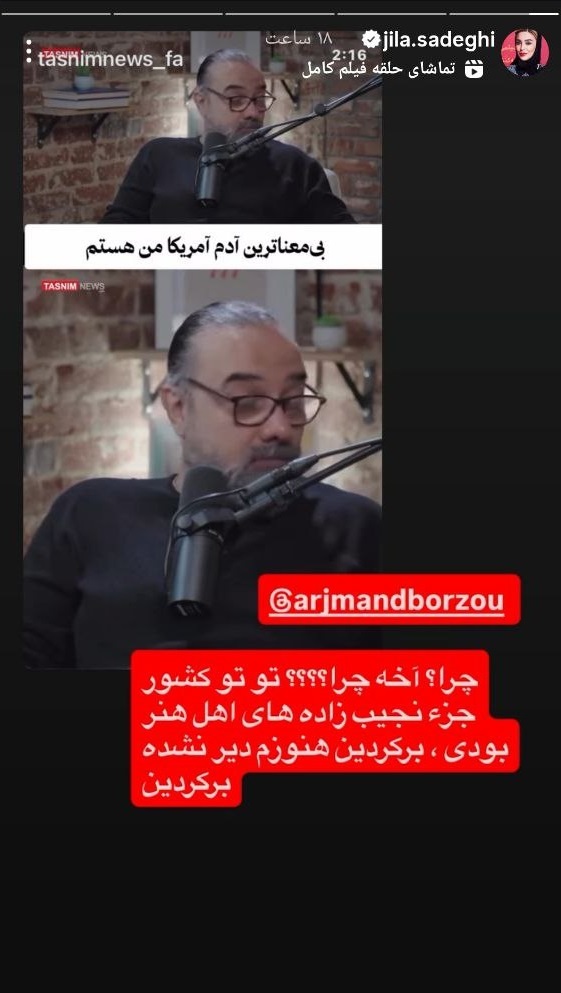 روزنو :استوری متفاوت ژیلا صادقی (مجری صداوسیما) برای برزو ارجمند (بازیگر سینما و تلویزیون) را در ادامه مشاهده می کنید. او در این استوری از برزو ارجمند خواسته تا به ایران بازگردد.