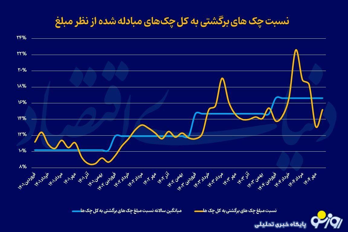 روزنو :شوک ناشی از جنگ ۱۲روزه در تابستان امسال، اثر معناداری بر وضعیت مبادلات تجاری و چک‌های برگشتی برجای گذاشت و آمار‌ها را به سطوح کم‌سابقه‌ای رساند. گزارش بانک مرکزی نشان می‌دهد نسبت مبلغ چک‌های برگشتی به کل چک‌های مبادله‌شده که در تیرماه به رکورد ۲۲.۶درصد رسید، در مرداد و شهریور نیز در سطوح بالای ۱۸درصد باقی ماند. از نظر تعداد نیز سهم چک‌های برگشتی از کل در تیرماه به بالاترین رقم از سال ۱۳۹۹ رسید.