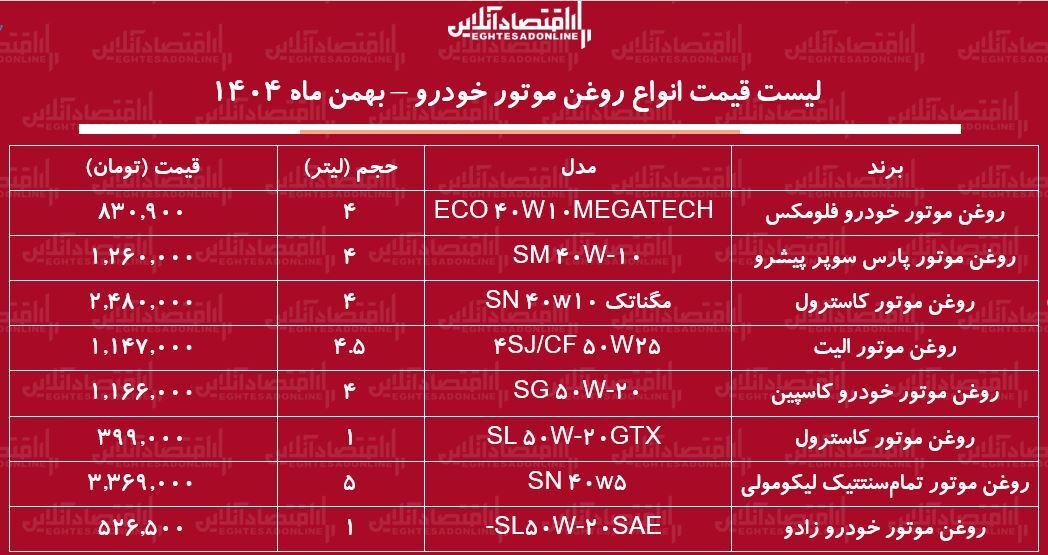 قیمت جدید انواع روغن موتور خودرو در بازار / روغن موتور ۴ لیتری کاسترول، کاسپین، الیت و...چند شد؟ + جدول بهمن ماه ۱۴۰۴