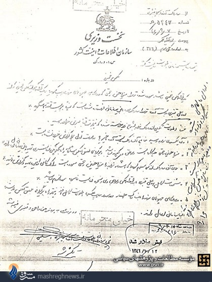 ضمناً اطلاعات تكميلی از ساواک مزبور به شرح زير خواسته شده كه نتيجه متعاقباً به عرض خواهد رسيد.
