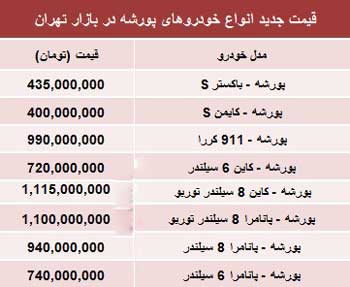 قیمت برخی از مدل های سواری پورشه در بازار تهران به شرح زیر است.